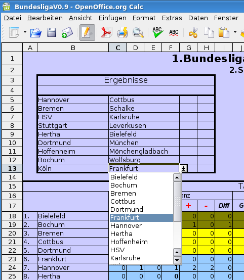 Bleibt nur noch, die Spielpaarungen für die ersten 17 Spieltage (die restlichen Spieltage ergeben sich automatisch) in die einzelnen Tabellen einzutragen. Hier ist leider etwas Handarbeit angesagt, ich hab aber versucht, die Tipparbeit auf ein Minimum zu reduzieren, schon um Tippfehler auszuschließen. Markiert die ensprechende Zelle, dann STRG+D und es wird Euch eine Liste der Vereine gezeigt. Einfach den entsprechenden Verein auswählen - fertig. Die Liste verhält sich wie alle derartigen Listen, d.h. beim Eintippen des Anfangsbuchstabens wird der erste Verein markiert, der dem Buchstaben entspricht.
