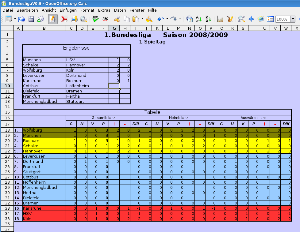 Die Sommerpause ist vorbei und ich hab die Zeit genutzt, das Calc-Dokument für die Freunde des Fußballs, speziell der Bundesliga, etwas benutzerfreundlicher zu gestalten. Die vorliegende Version ist vorbereitet für die 1.Bundesliga der Saison 2008/2009, läßt sich aber leicht auch für die 2.Liga und für die nächsten Jahre verwenden. Die Bedienung ist relativ selbsterklärend. Jeder Spieltag ist in einer eigenen Tabelle hinterlegt. Ihr tragt einfach die Ergebnisse in die entsprechenden Zellen ein, die Tabelle errechnet und sortiert sich dann automatisch. Beim Laden des Dokuments muß allerdings zwingend die Ausführung von Makros zugelassen werden.