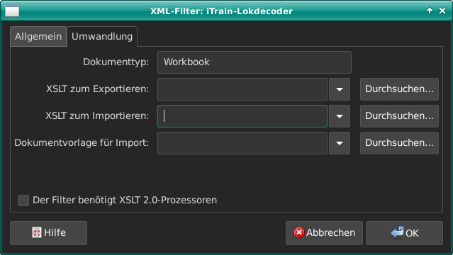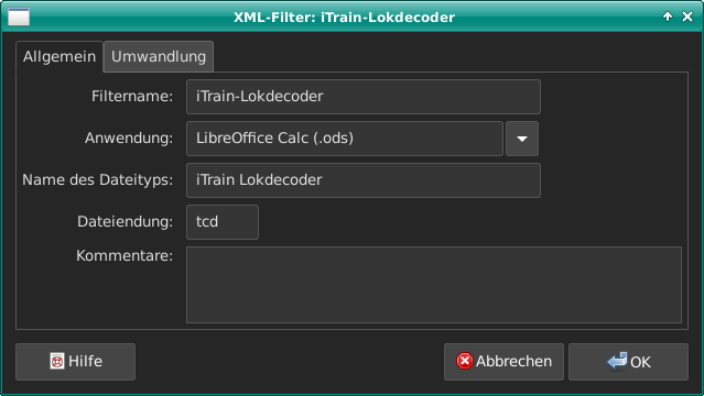 Da die in LibreOffice enthaltenen XML-Filter mit dem iTrain-Format nicht umgehen können, musste ein eigens für diesen Zweck geschriebener her. Die Anweisungen, wie die Daten aus iTrain ausgelesen und in Calc importiert werden, stehen in einer XSLT-Datei. Ladet Euch diesen Filter hier herunter und speichert ihn an einem Ort Eurer Wahl.