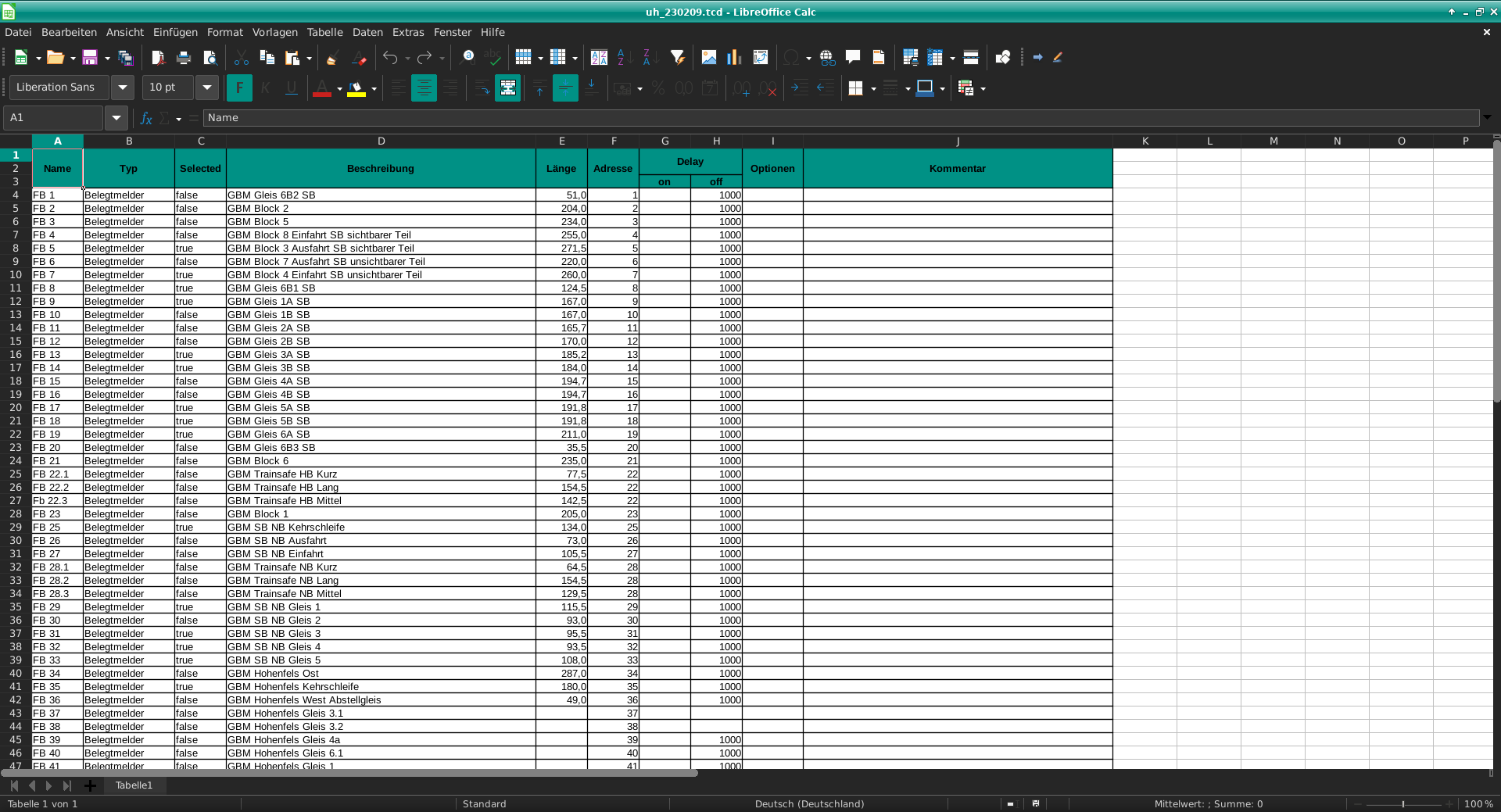 Die Exportieren-Funktion in iTrain exportiert u.a. die Rückmelderdaten ins CSV-Format, welches man in diverse Tabellen-Kalkulationsprogramme wie LibreOffice Calc importieren kann. Die resultierende CSV-Datei enthält aber nur einen Teil der Daten. Um an die kompletten Daten zu kommen, muss der Datenimport in Calc über einen speziellen XML-Filter vorgenommen werden. Das Vorhalten der Daten in einer Tabelle hat den Vorteil, dass man einerseits die Daten besser vergleichen kann, als das in der Eingabemaske von iTrain möglich ist. Andererseits lassen sich die Daten nach bestimmten Kriterien filtern.