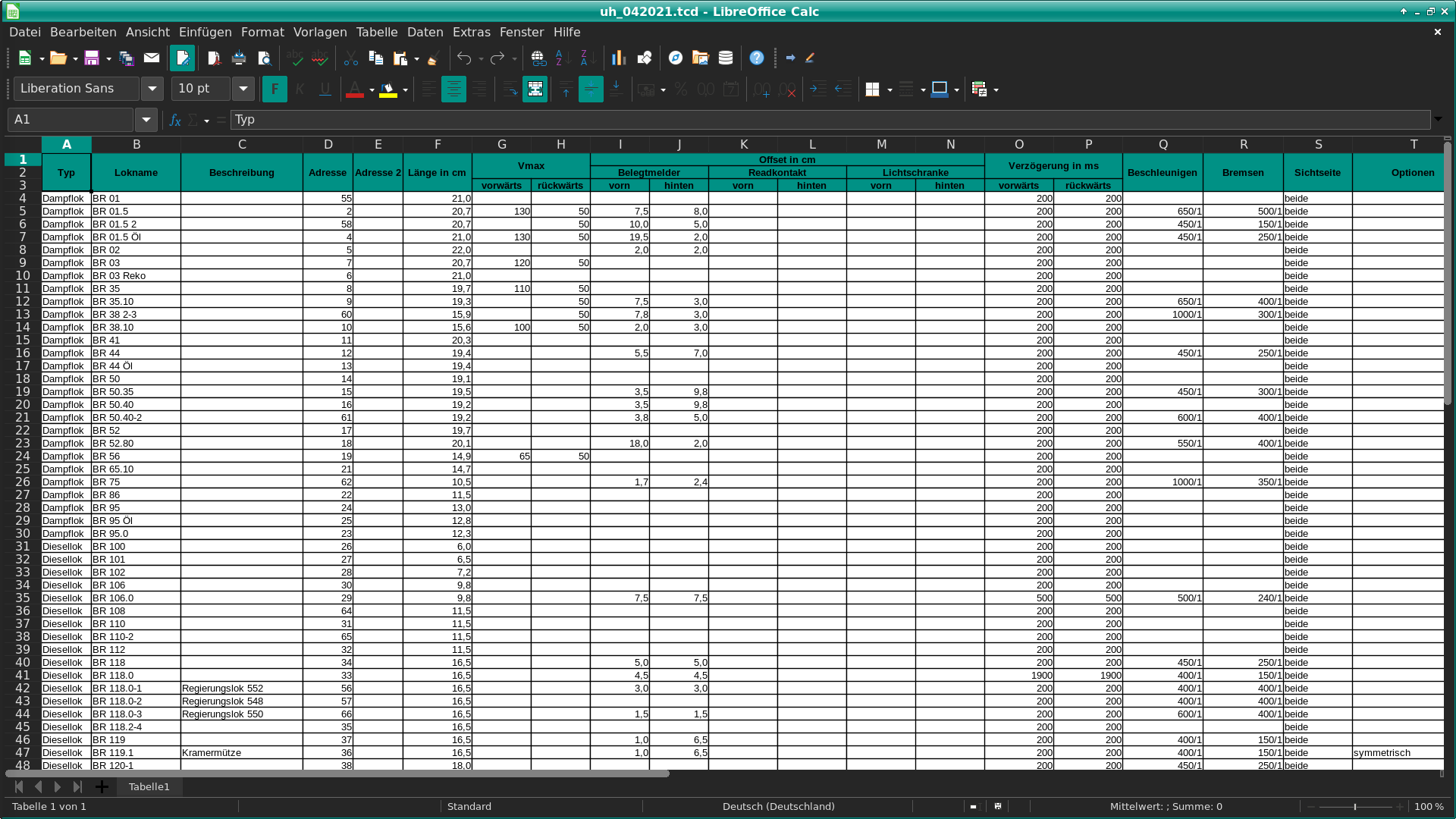 Die Exportieren-Funktion in iTrain exportiert u.a. die Lokomotiv-Daten ins CSV-Format, welches man in diverse Tabellen-Kalkulationsprogramme wie LibreOffice Calc importieren kann. Die resultierende CSV-Datei enthält aber nur einen Teil der Daten. Um an die kompletten Daten zu kommen, muss der Datenimport in Calc über einen speziellen XML-Filter vorgenommen werden. Das Vorhalten der Daten in einer Tabelle hat den Vorteil, dass man einerseits mehrere Lokomotiven besser vergleichen kann, als das in der Eingabemaske von iTrain möglich ist. Andererseits lassen sich die Daten nach bestimmten Kriterien filtern. Nicht zuletzt kann man die Daten auch einfacher in andere Datenbanken übertragen, um z.B. seine Sammlung zu erfassen. So müssen die Daten nicht doppelt eingegeben werden.
