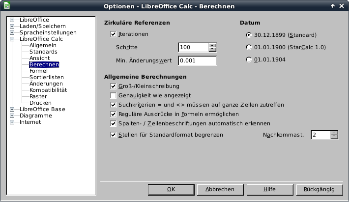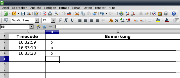 Eine Tabelle, die ich beruflich immer mal wieder brauche, ist die Shotliste. Hier wird in Abhängigkeit von einem vorhandenen Eintrag in Spalte B in Spalte A die aktuelle Uhrzeit sekundengenau eingetragen. Dazu muss in Calc unter Extras -> Optionen -> LibreOffice Calc -> Berechnen die Iteration eingestellt sein.