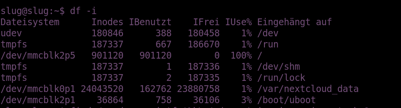 Laut der Ausgabe ist noch ausreichend Speicherplatz vorhanden. Ist also die Fehlermeldung falsch? Schauen wir uns dazu die Ausgabe von df -i an, die uns die Verteilung der zur Verfügung stehenden Inodes anzeigt.
