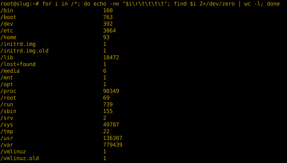 for i in /*; do echo -ne "$i\r\t\t\t\t"; find $i 2>/dev/zero | wc -l; done